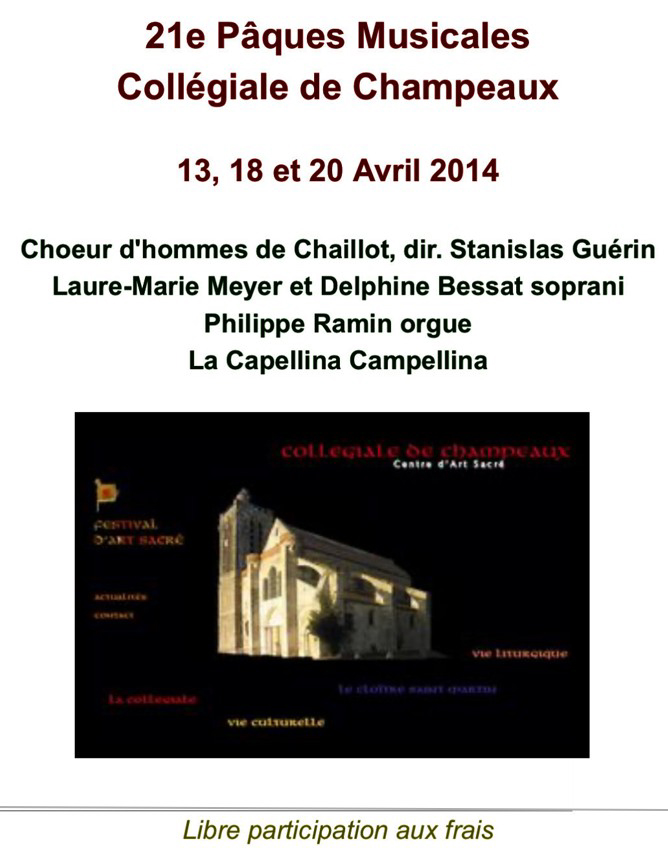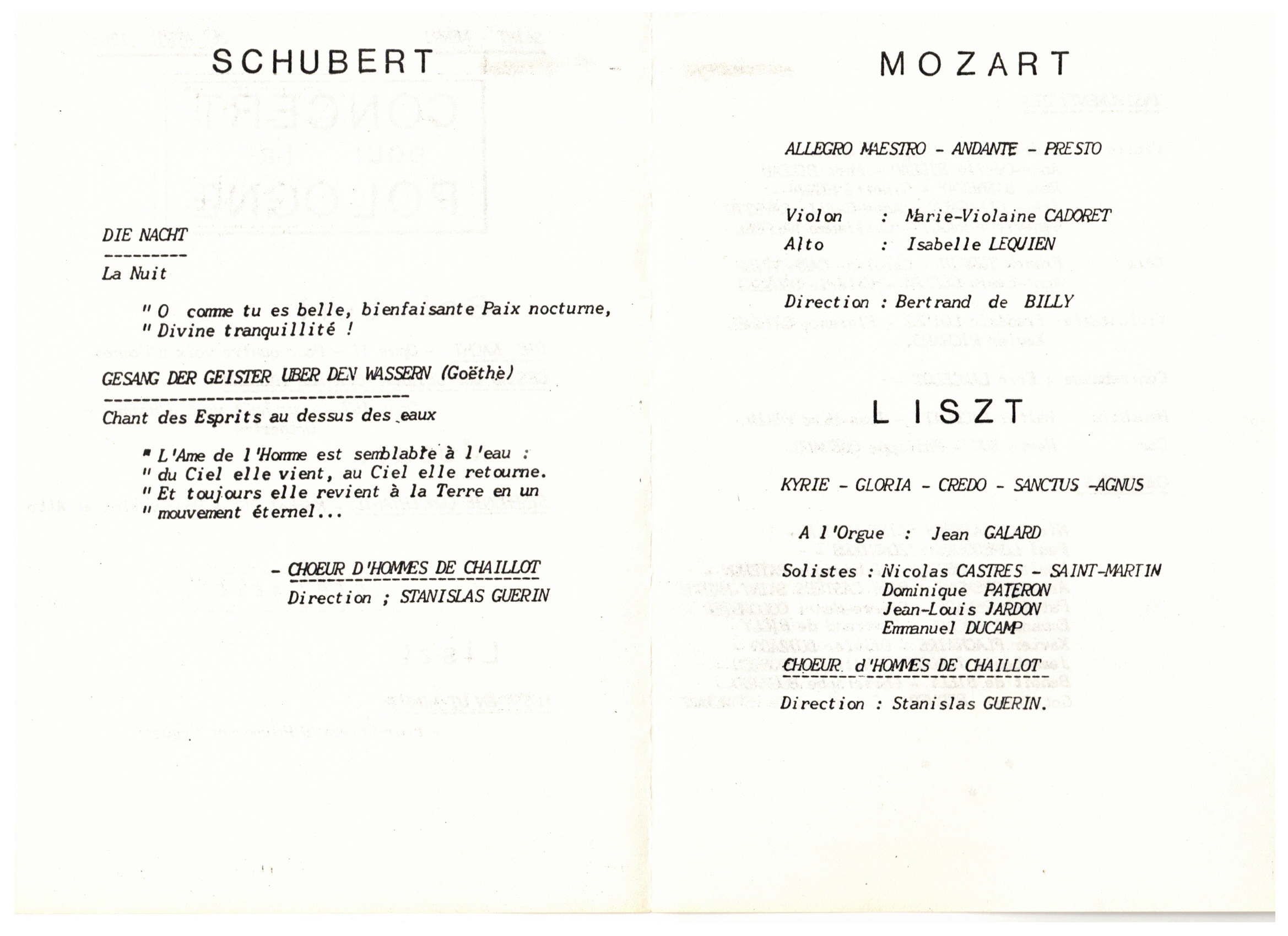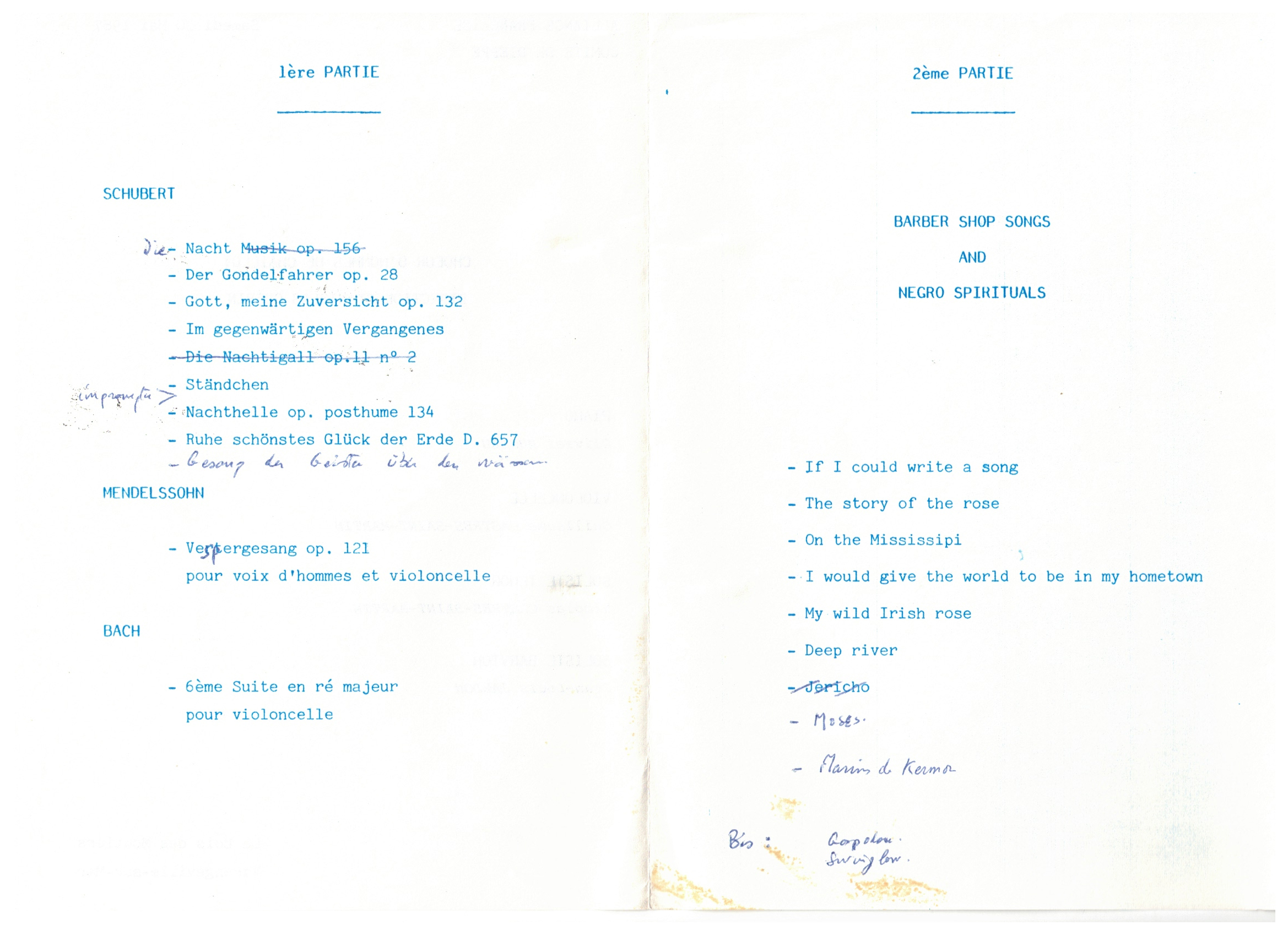 Janequin, Lassus, Costeley, Barber shop, Passereau, Poulenc Duparc, Massenet, Donizetti, Bizet, Britten, Orff Schubert, Shumann, Rameau, Mozart, Bovet, Chesnokov |