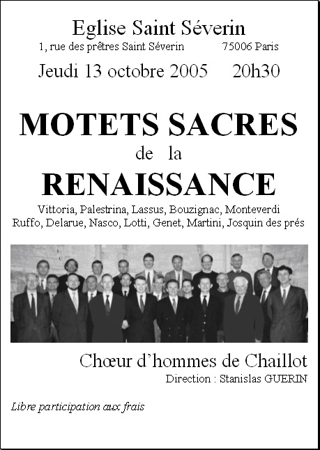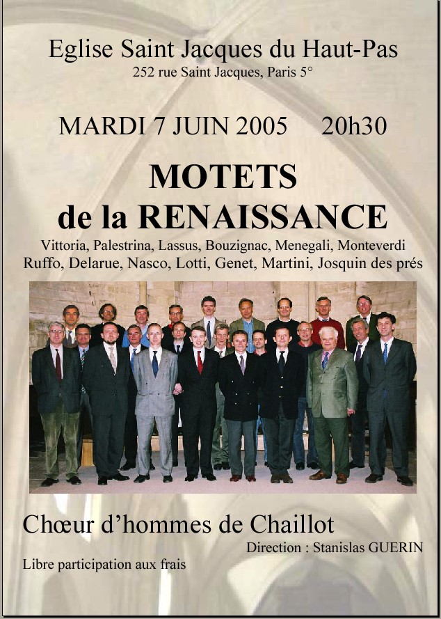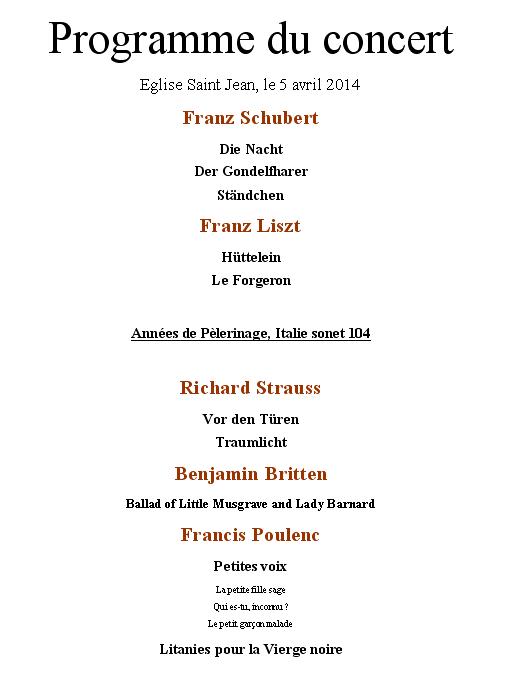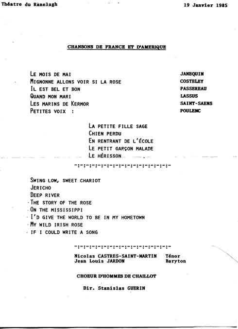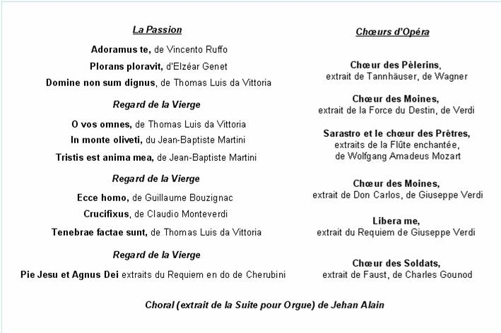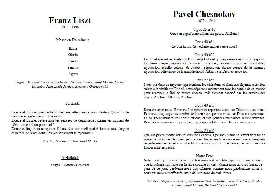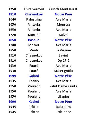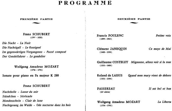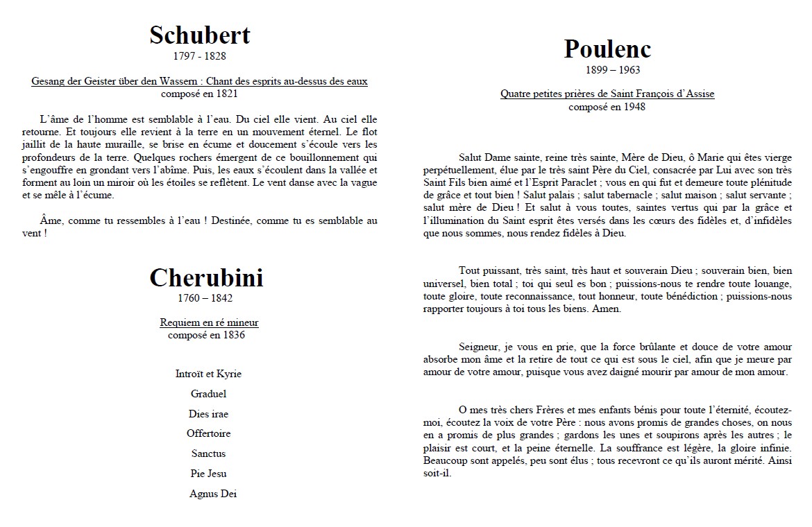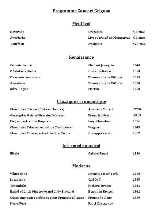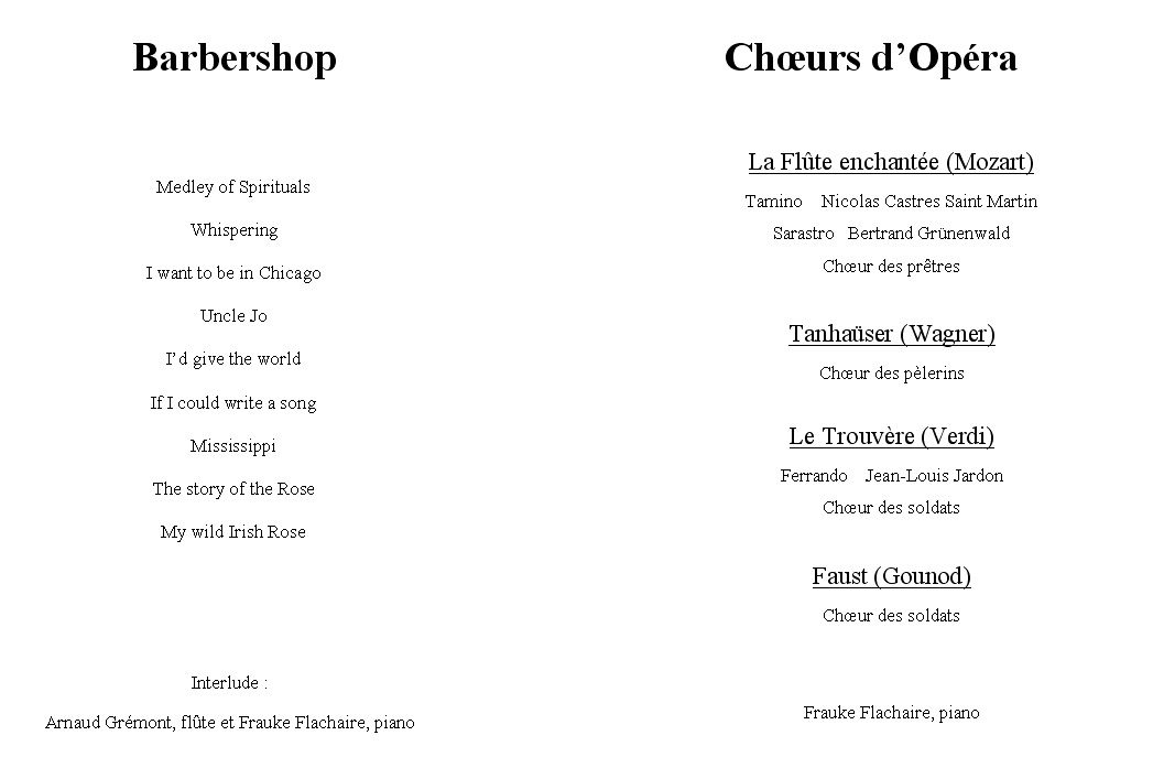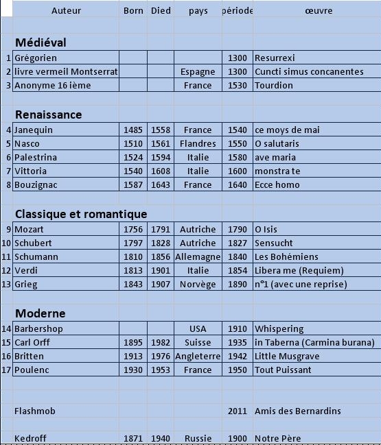 Janequin, Lassus, Costeley, Barber shop, Passereau, Poulenc Duparc, Massenet, Donizetti, Bizet, Britten, Orff Schubert, Shumann, Rameau, Mozart, Bovet, Chesnokov |