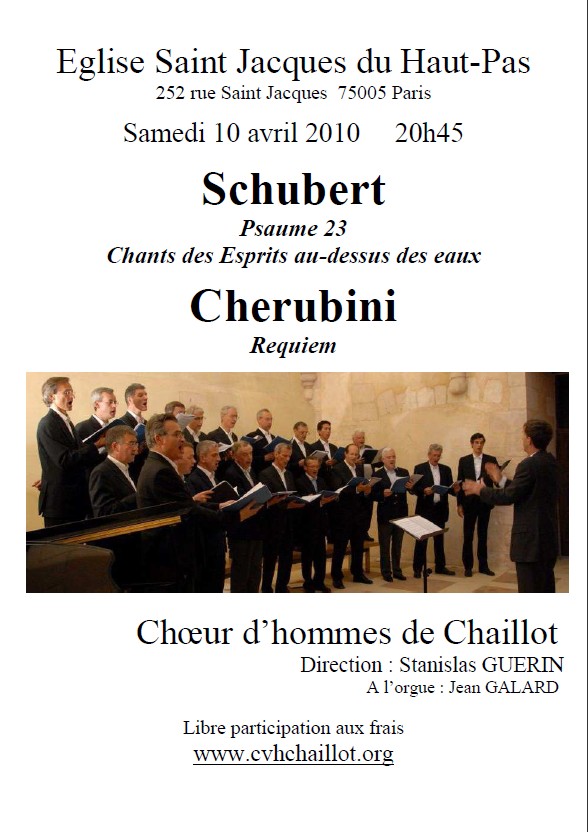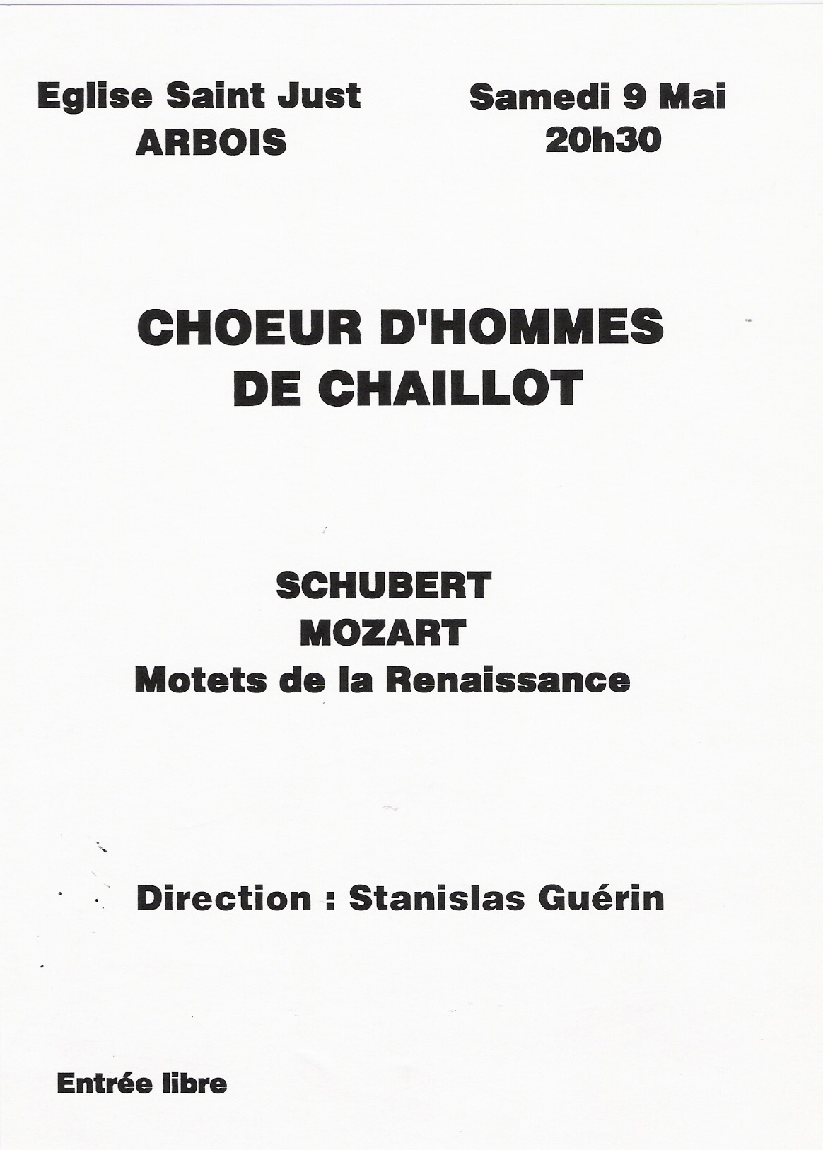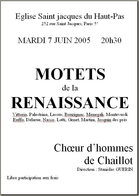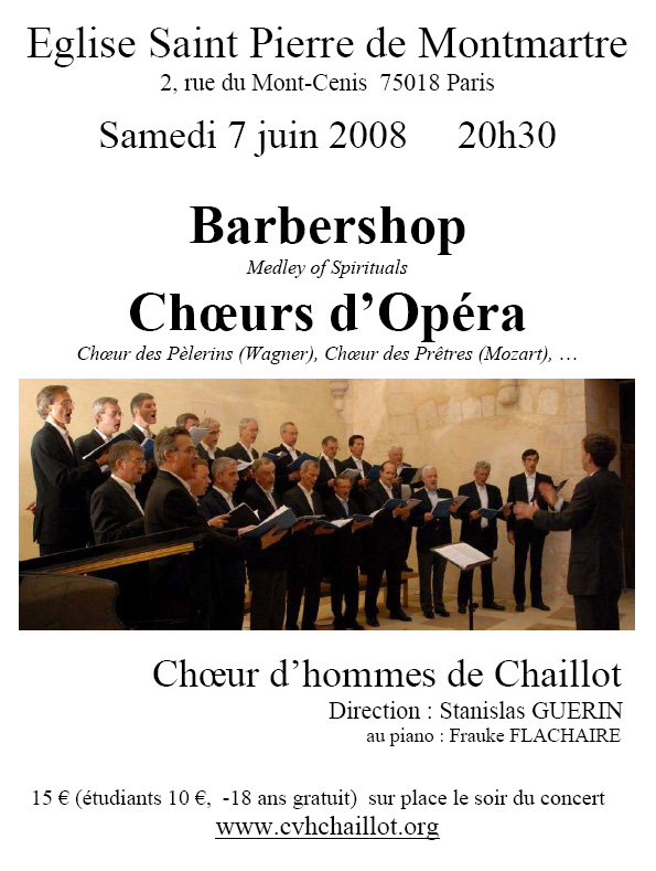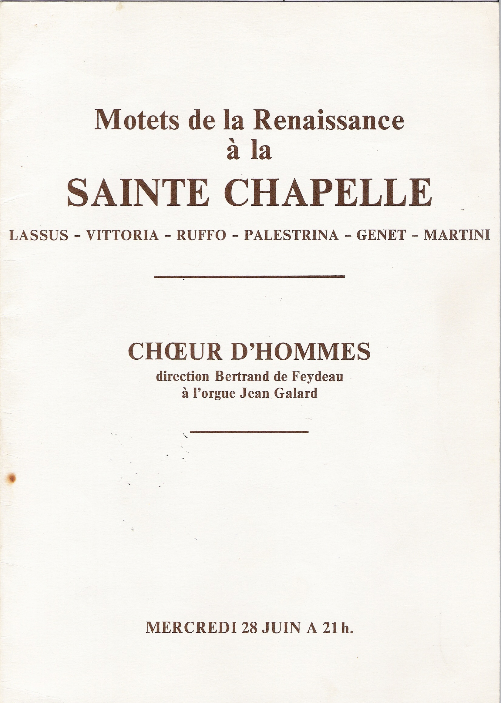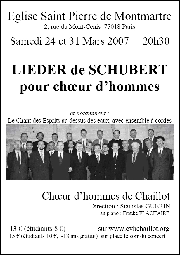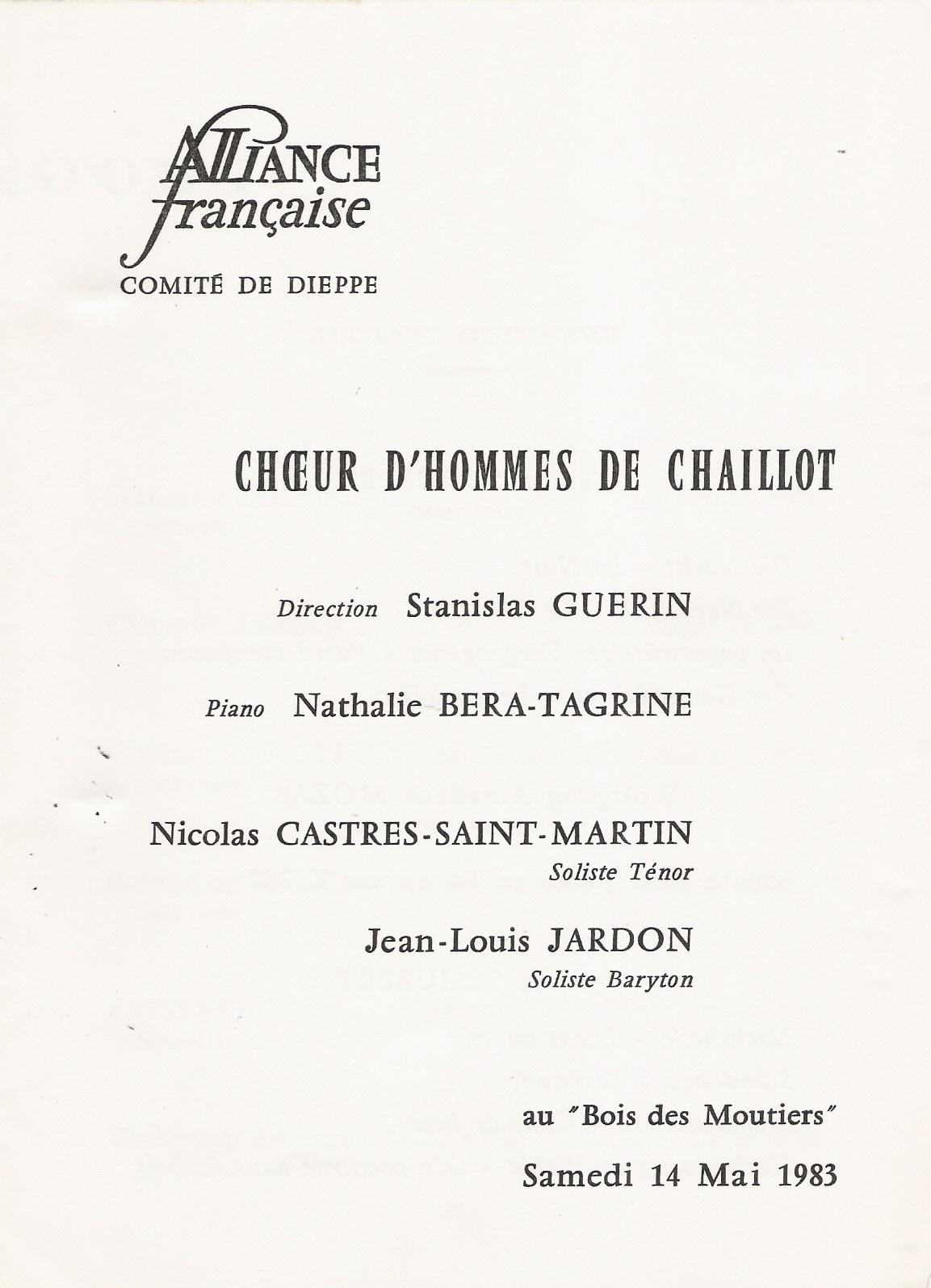 Janequin, Lassus, Costeley, Barber shop, Passereau, Poulenc Duparc, Massenet, Donizetti, Bizet, Britten, Orff Schubert, Shumann, Rameau, Mozart, Bovet, Chesnokov |