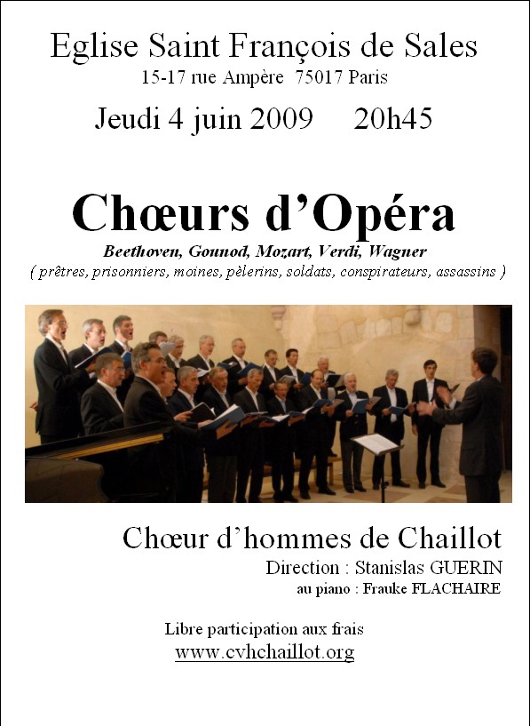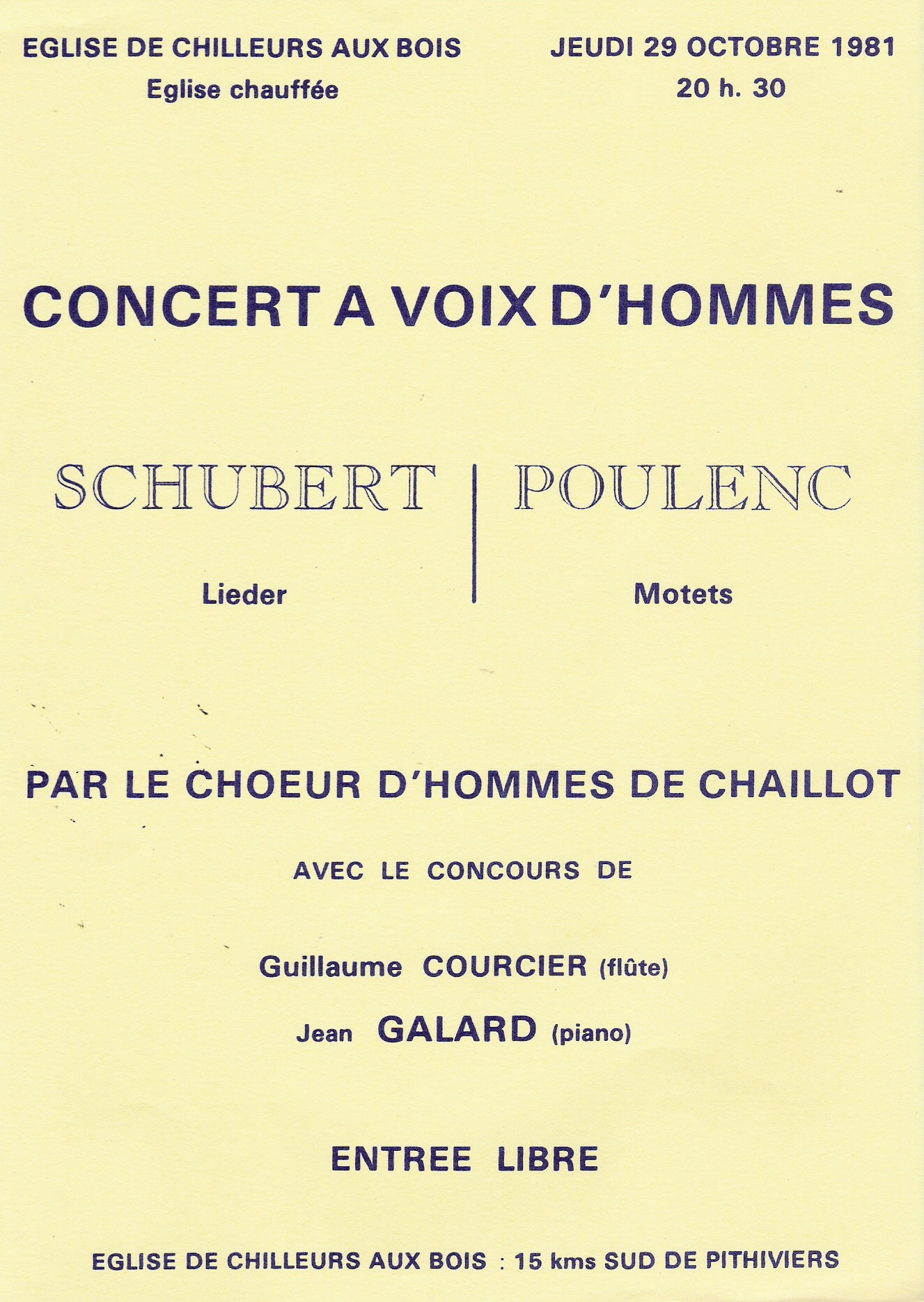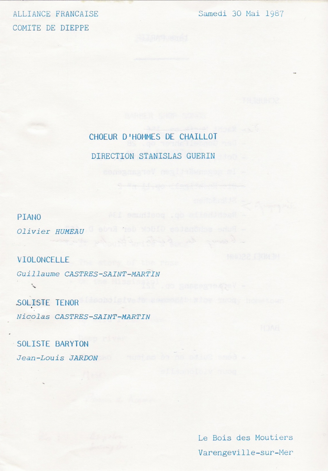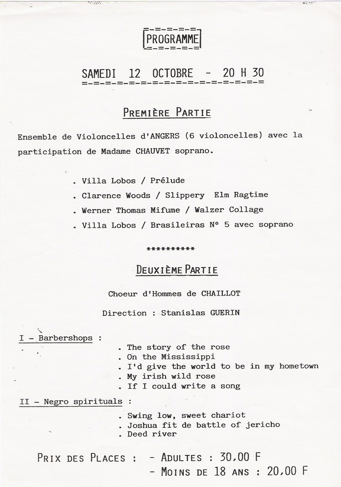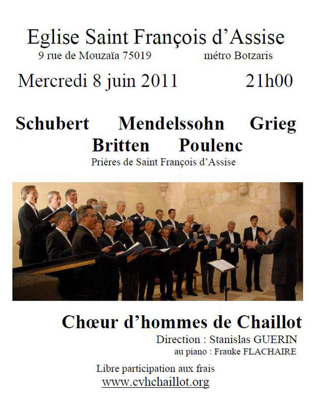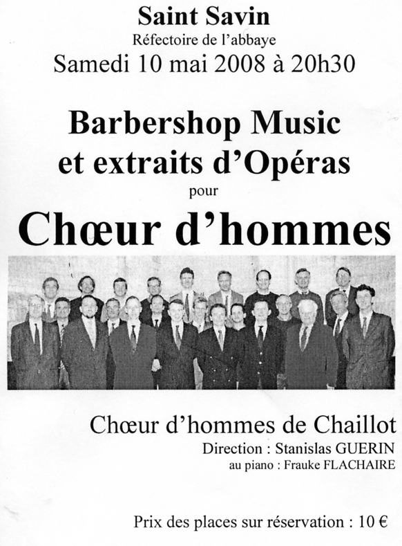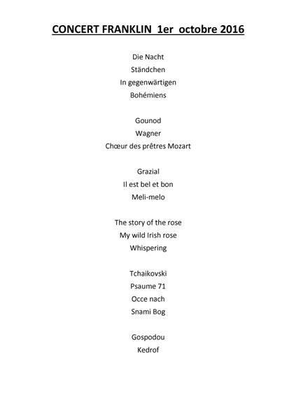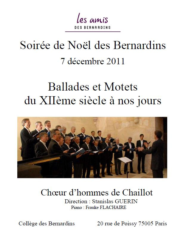 Janequin, Lassus, Costeley, Barber shop, Passereau, Poulenc Duparc, Massenet, Donizetti, Bizet, Britten, Orff Schubert, Shumann, Rameau, Mozart, Bovet, Chesnokov |