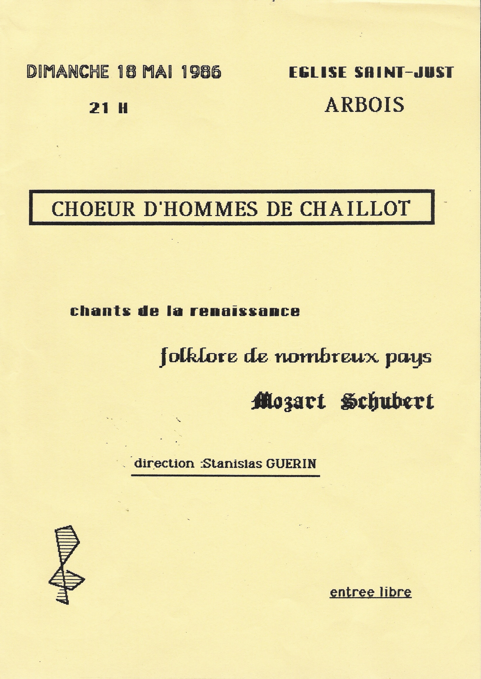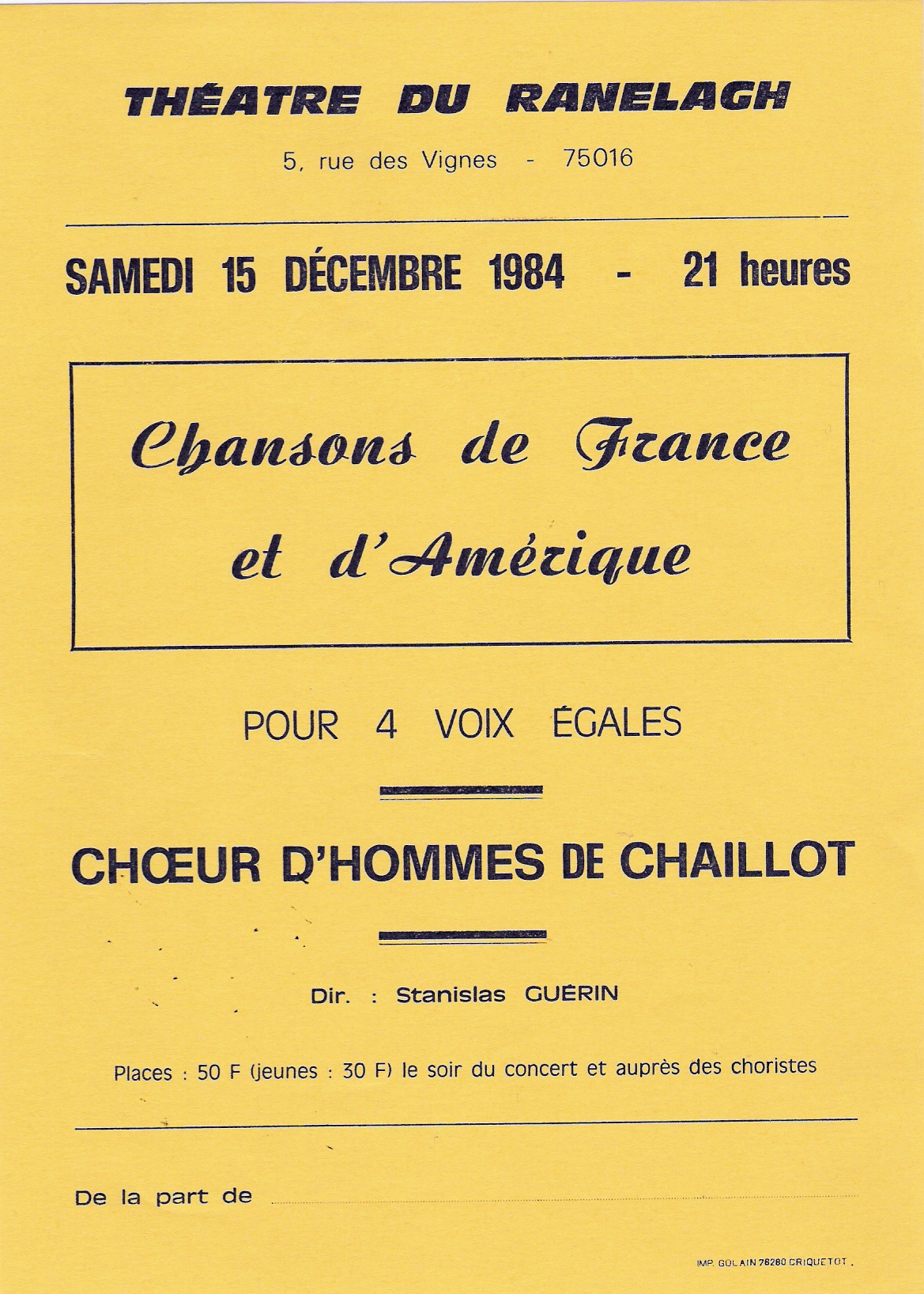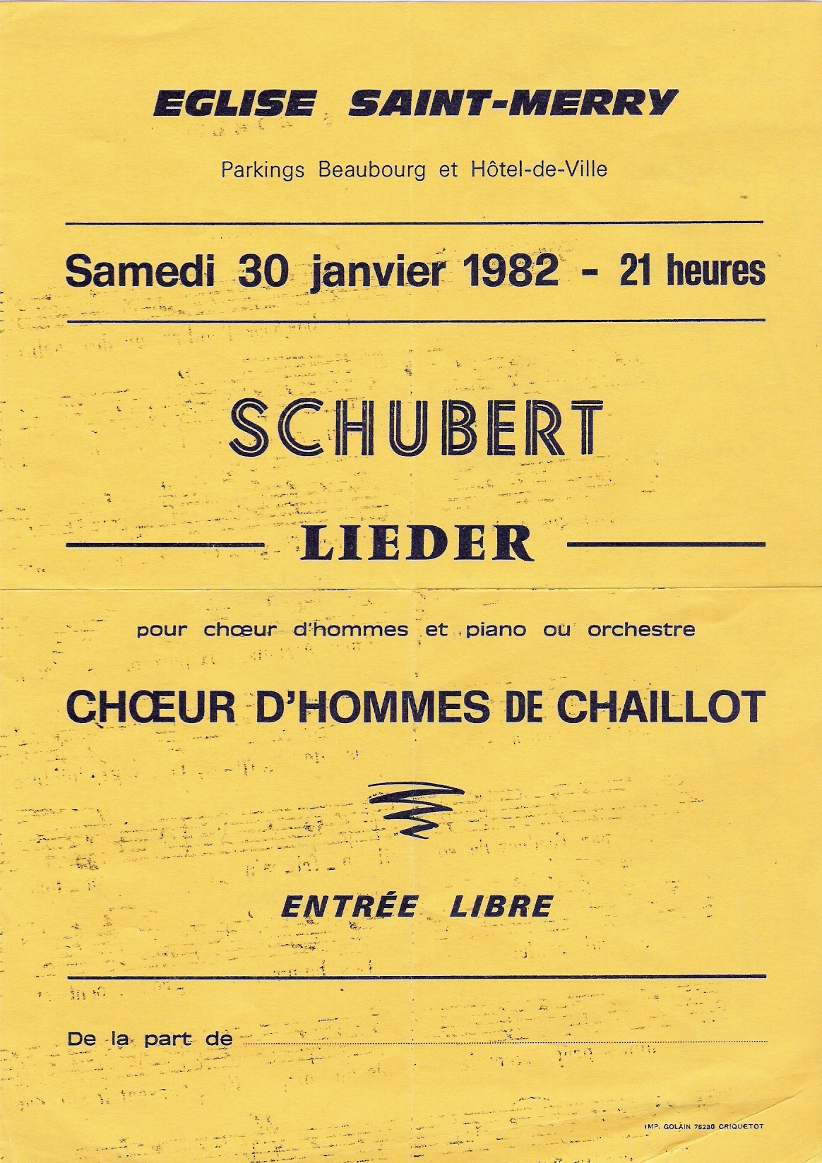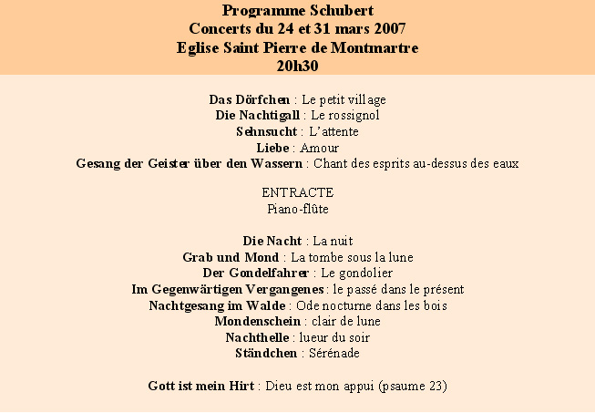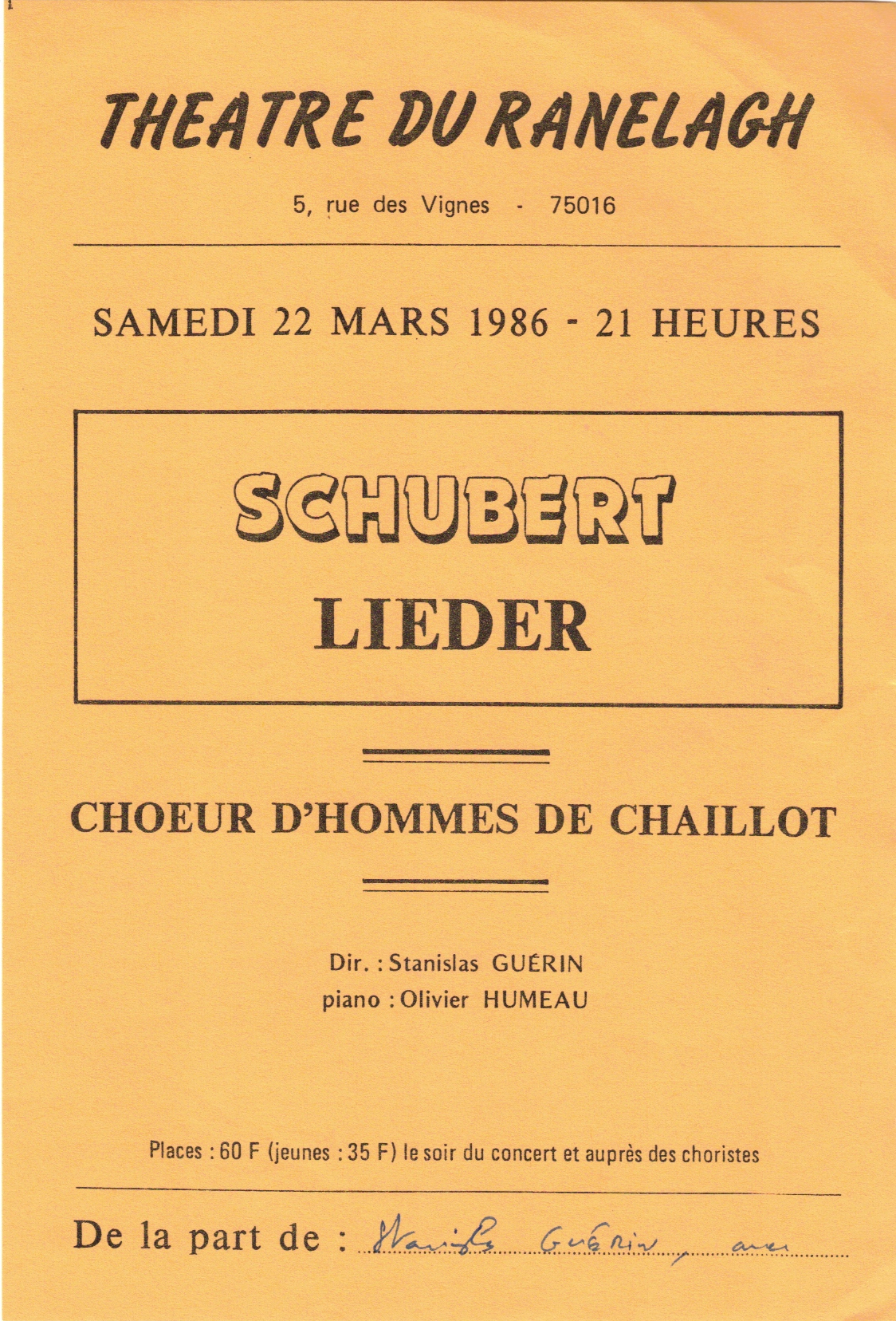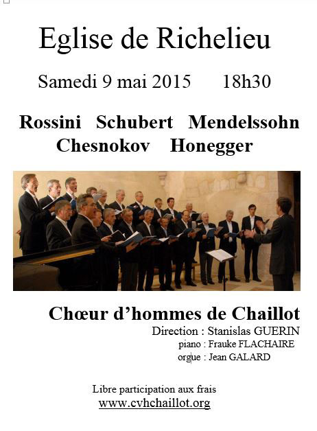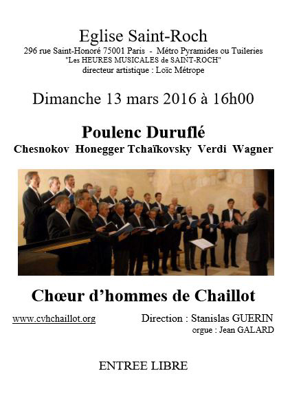 Janequin, Lassus, Costeley, Barber shop, Passereau, Poulenc Duparc, Massenet, Donizetti, Bizet, Britten, Orff Schubert, Shumann, Rameau, Mozart, Bovet, Chesnokov |
