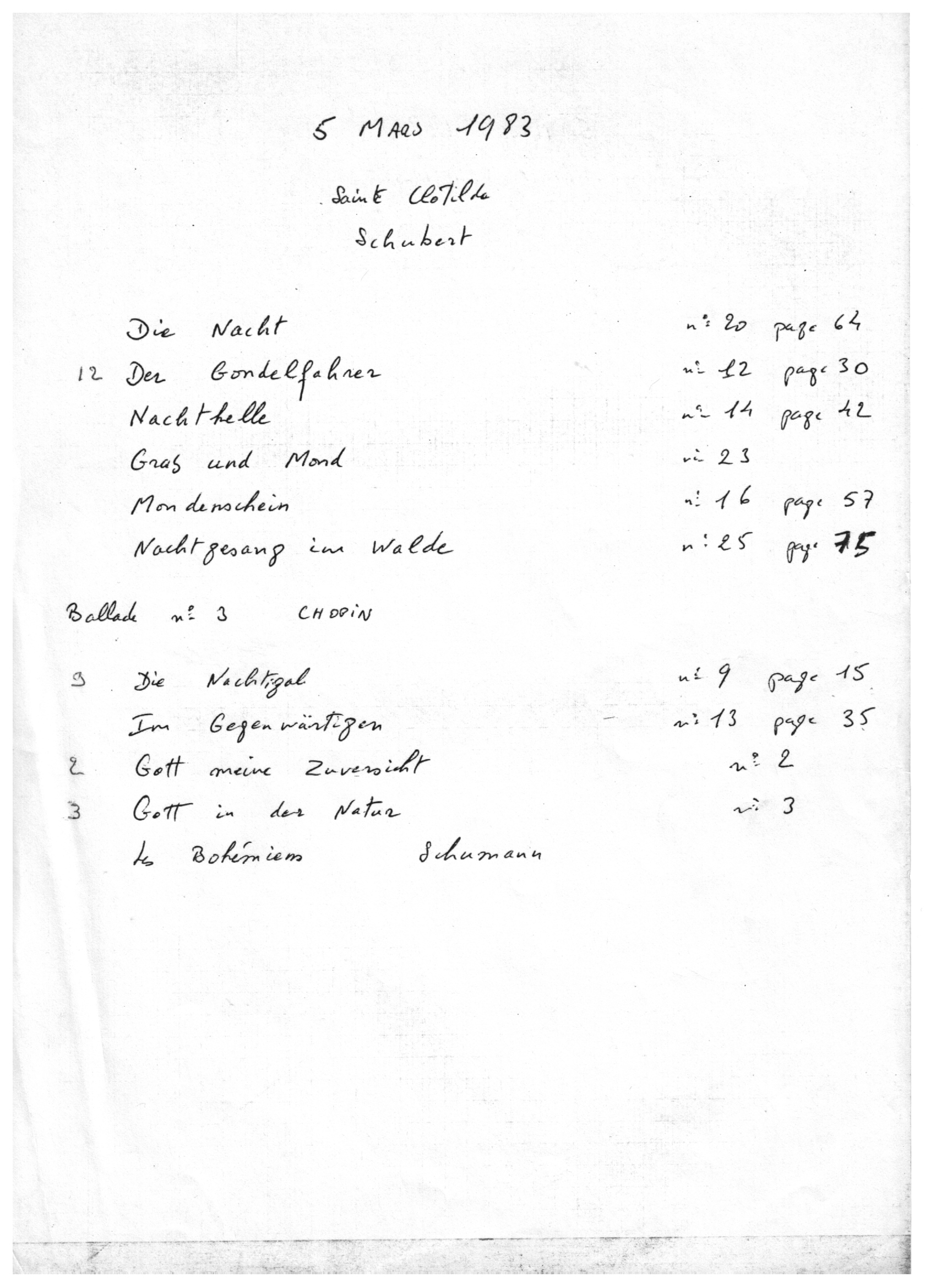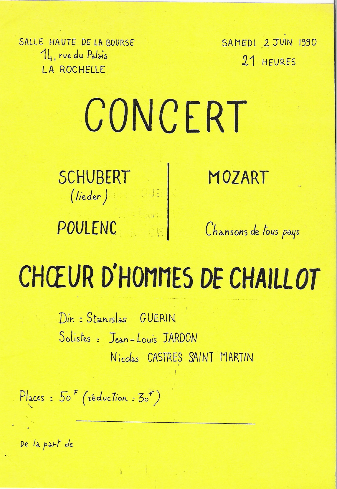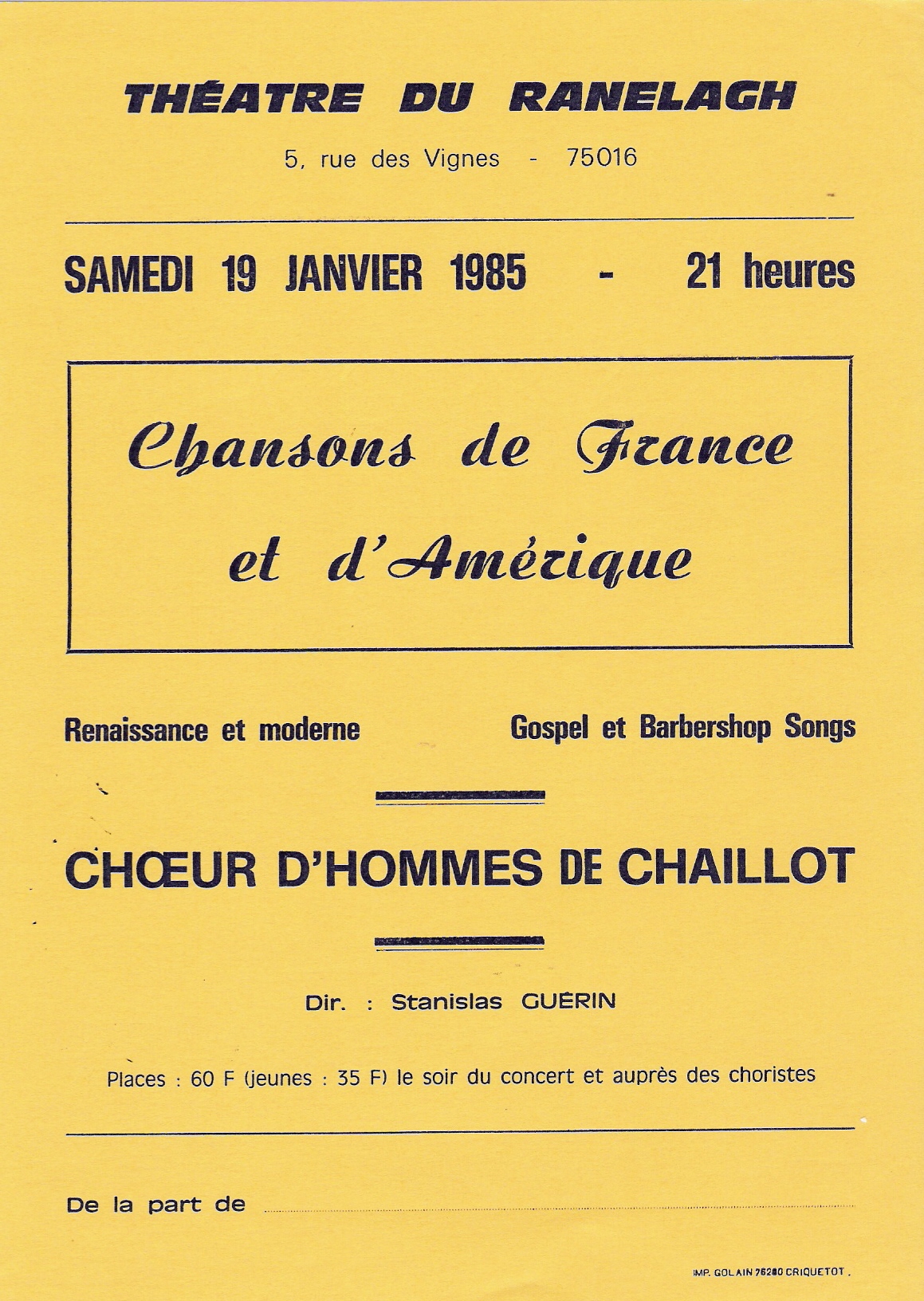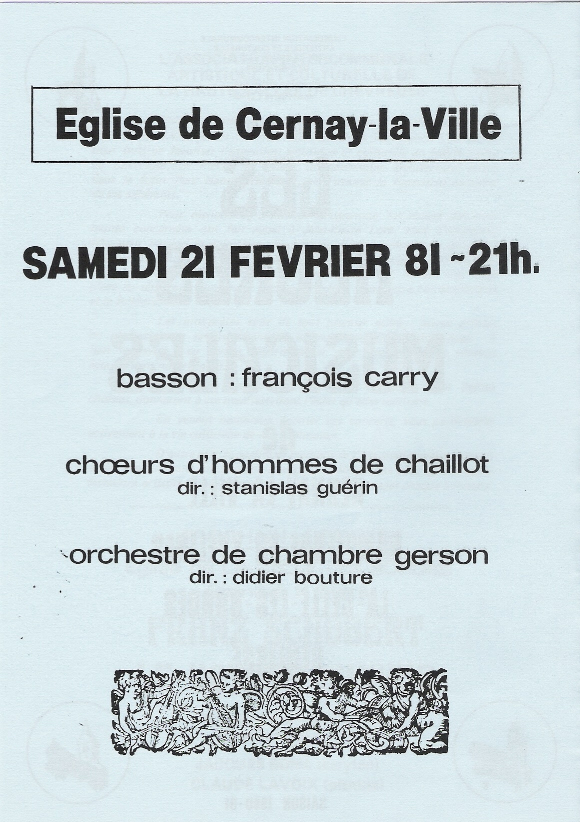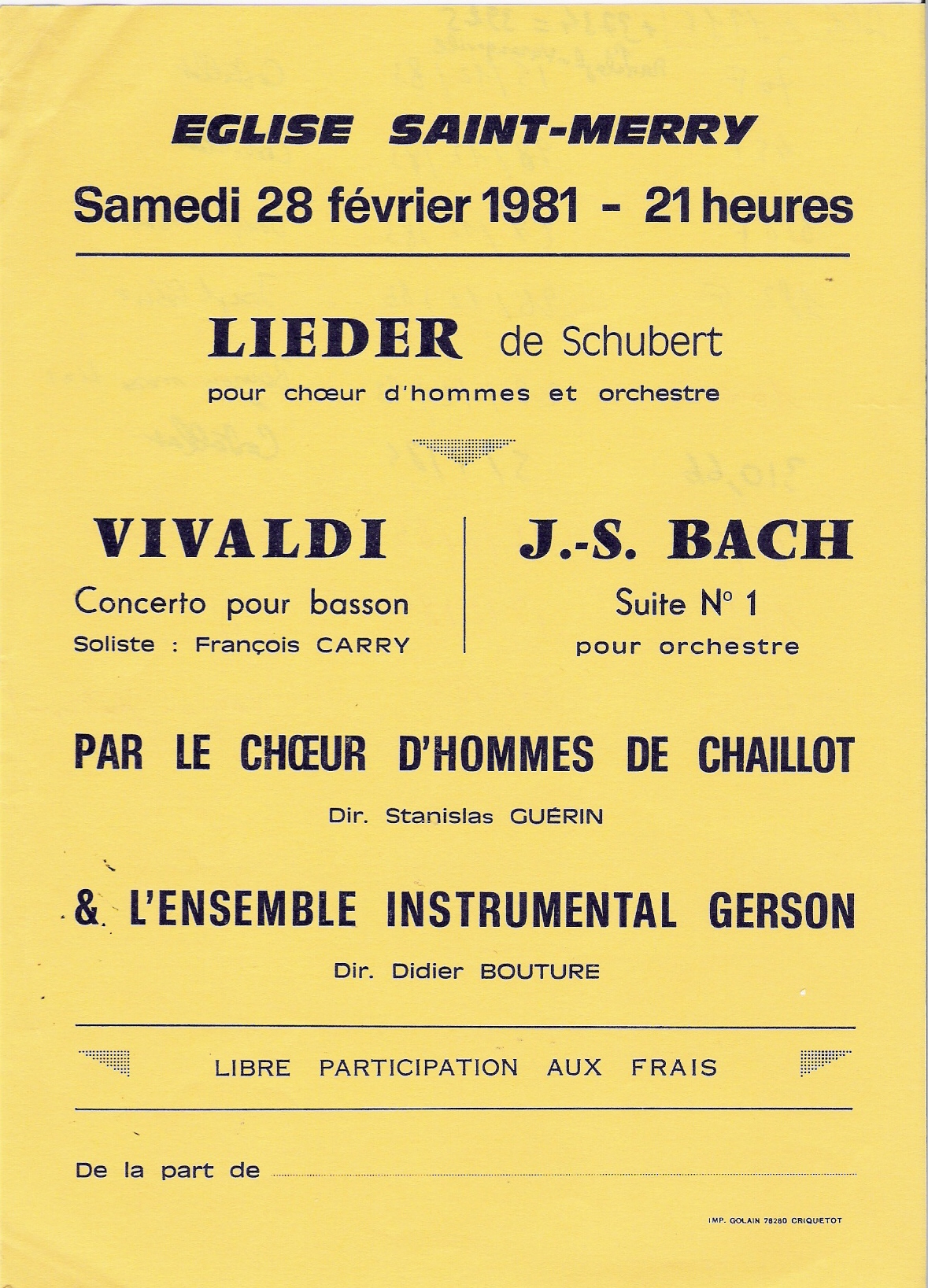 Janequin, Lassus, Costeley, Barber shop, Passereau, Poulenc Duparc, Massenet, Donizetti, Bizet, Britten, Orff Schubert, Shumann, Rameau, Mozart, Bovet, Chesnokov |
