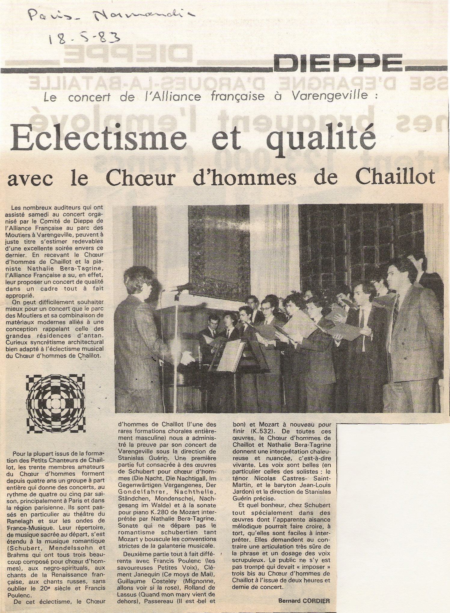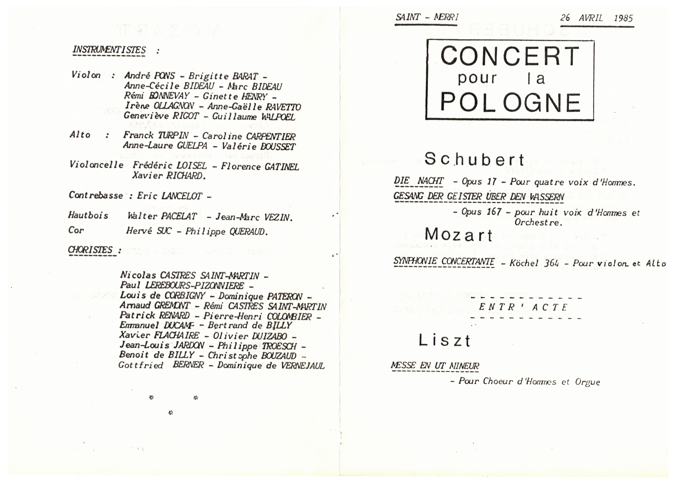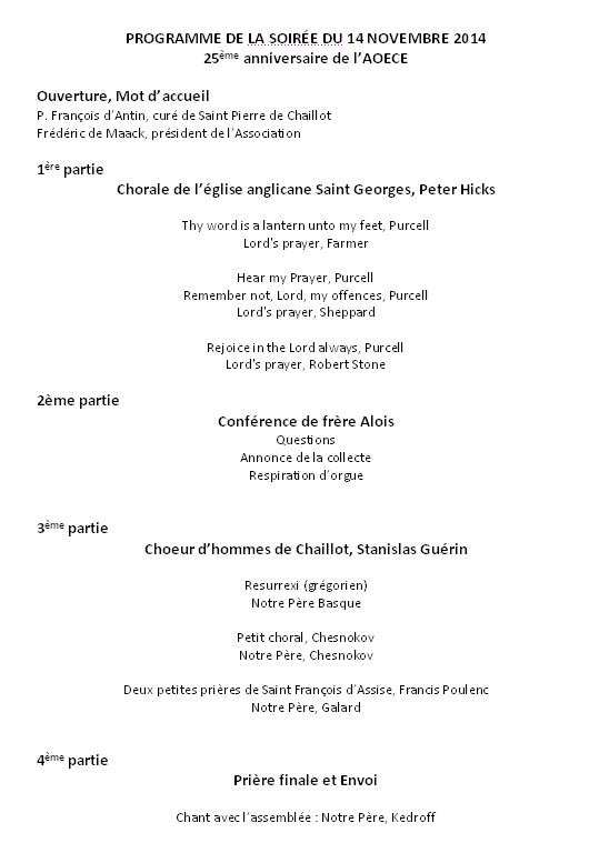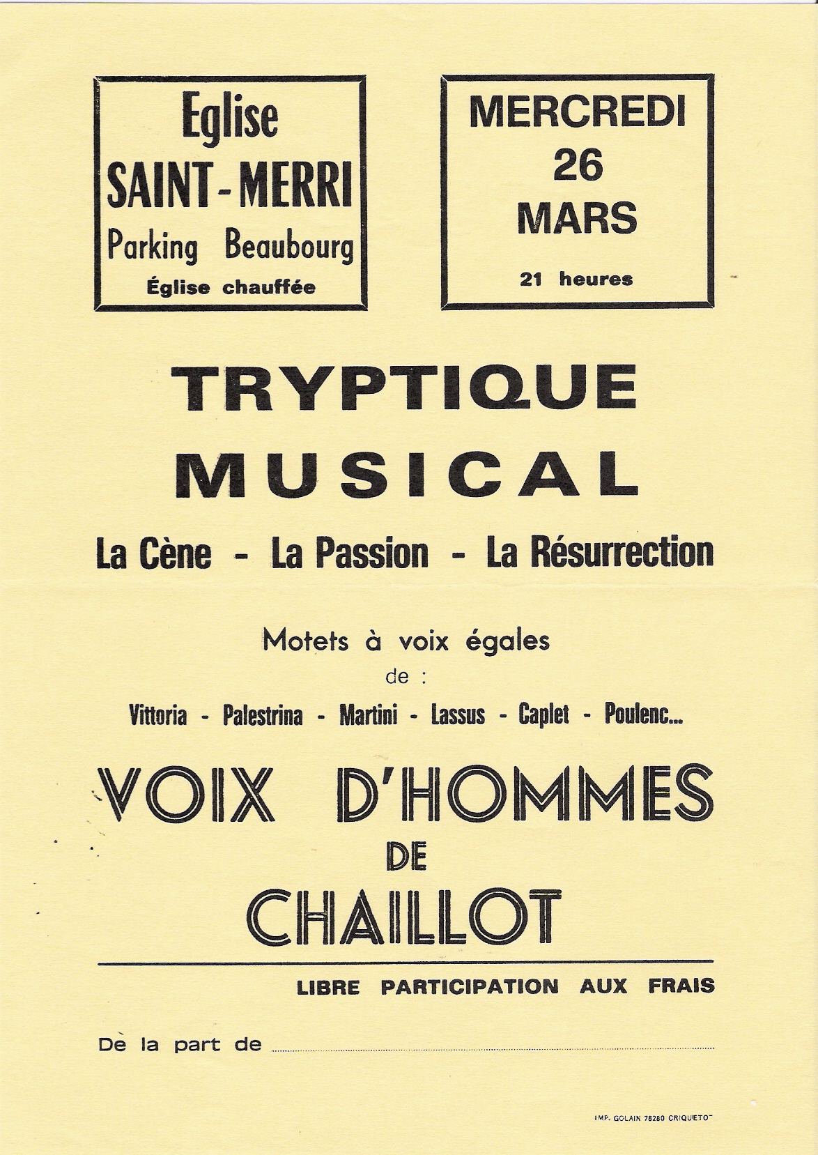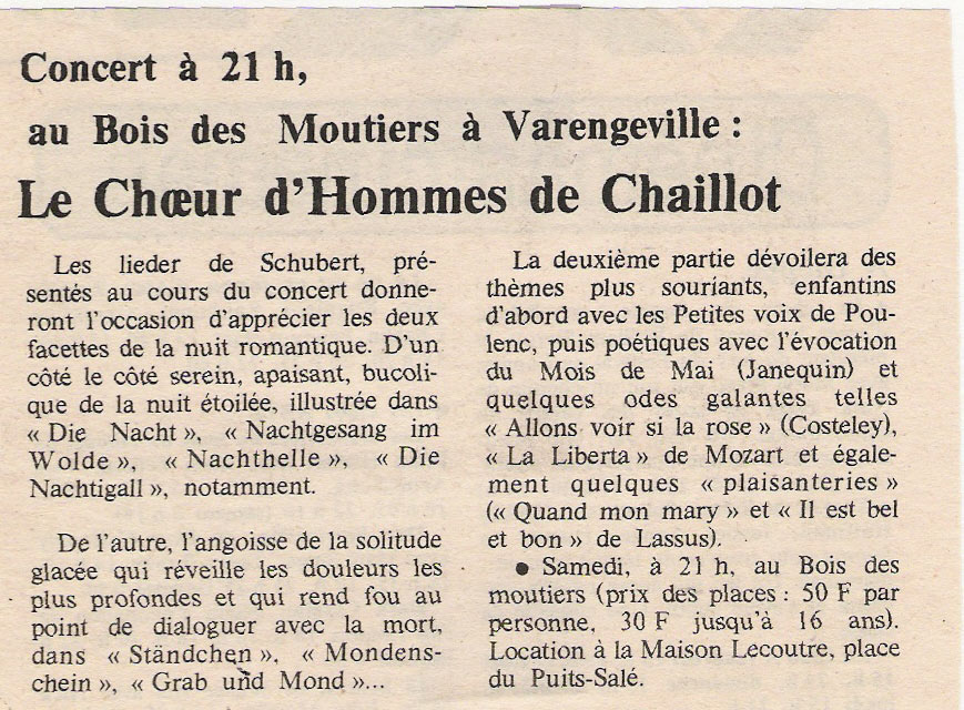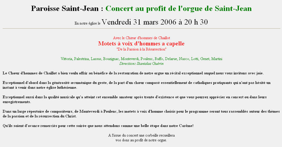 Janequin, Lassus, Costeley, Barber shop, Passereau, Poulenc Duparc, Massenet, Donizetti, Bizet, Britten, Orff Schubert, Shumann, Rameau, Mozart, Bovet, Chesnokov |